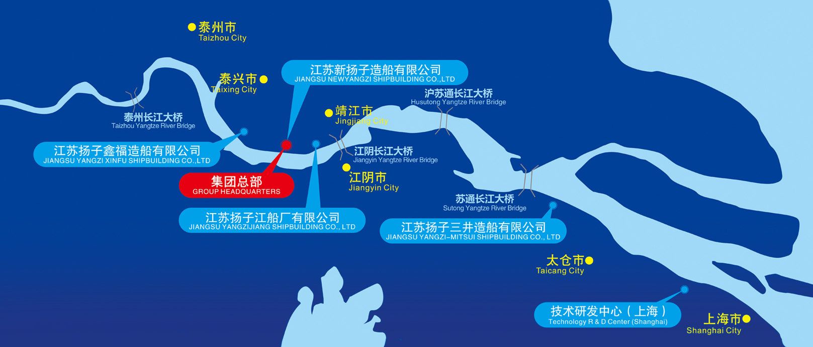 集團(tuán)公司下轄江蘇新?lián)P子造船有限公司、江蘇揚(yáng)子鑫福造船有限公司、江蘇揚(yáng)子三井造船有限公司及江蘇揚(yáng)子江船廠(chǎng)有限公司4家造船企業(yè),分布于長(zhǎng)江下游江蘇省境內(nèi)的靖江市、泰興市和太倉(cāng)市的黃金水道兩岸,距上海、南京兩大城市均170公里。