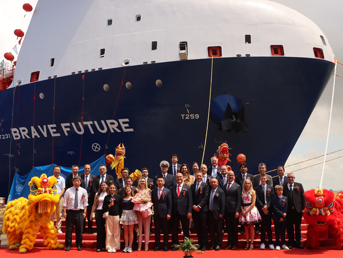 揚子三井代表宋書明先生表示:“繼今年1月“Brilliant Future”號成功交付后,我們迎來了第二艘雙燃料LEG運輸船的交付。值此機會,我們衷心感謝Braskem的Cristiane女士、Hardi先生,以及Ocean Yield的Andreas先生。感謝Hartmann集團的Hartmann博士、Adami船長、Ionut Cornea先生、龍葉飛先生,感謝AC-INOX的Sascha先生。感謝整個Hartmann團隊始終如一的支持,也感謝DNV船級的專業(yè)指導。同時,向所有參與本船建造的YAMIC員工致以誠摯謝意。未來,我們將繼續(xù)與各方緊密合作,為船東研發(fā)建造更加安全、更加綠色、更高性能的綠色能源氣體運輸船產(chǎn)品?!?/span>教母Cristiane Rego女士為新船命名并擲香檳禮,現(xiàn)場鞭炮齊鳴、禮花綻放,汽笛共鳴,龍獅共舞,祝福新船和船員航行平安,勇敢前行,為船東和租家?guī)砗眠\與財富,也為Hartmann、DNV和揚子三井贏得榮耀,帶給所有人勇氣與希望。Hartmann代表Adami Ulrich表示:“衷心感謝揚子三井團隊。揚子三井憑借嚴謹?shù)墓芾砗椭苊艿挠媱?,確保了本船的順利交付。我們對揚子三井未來的發(fā)展充滿信心,也感謝所有為此付出努力的員工?!?/span>Braskem代表Hardi Schuck表示:“正是由于揚子三井在船舶建造過程中的專業(yè)精神與奉獻,讓我們對Brave Future感到無比自豪?!?/span>