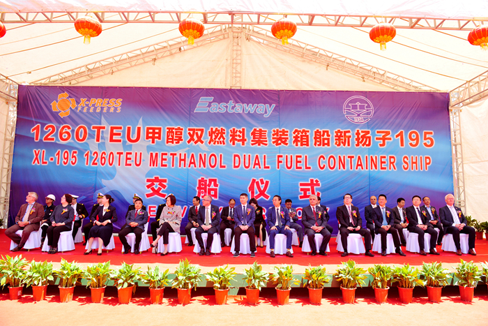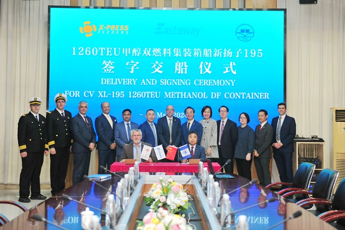 On the morning of May 16, the first 1260TEU methanol dual fuel container vessel built by our group's New Yangzi Shipbuilding for the Singapore shipowner X-Press Feeders signed for delivery. This type of vessel is an open feeder container vessel with a capacity of 1260TEU, which can load four different sizes of containers. This vessel measures 148m in length, 27.2m in moulded width, 14.3m in moulded depth, a scantling draft of 8.1m, a design speed of 14kn, and is equipped with two methanol fuel storage tanks and one methanol daily service tank.