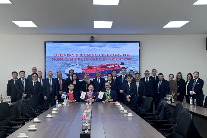 On the morning of January 14th, Yang-zi Mitsui Shipbuilding held a grand naming ceremony for the vessel. Ms. Silvia Pires Migueles, the godmother of the vessel, named the vessel and tossed champagne. The signing and delivery ceremony of "BRILLIANT FUTURE", the first dual-fuel LEG carrier built by Yang-zi Mitsui, was also completed on the same day of the naming ceremony.
